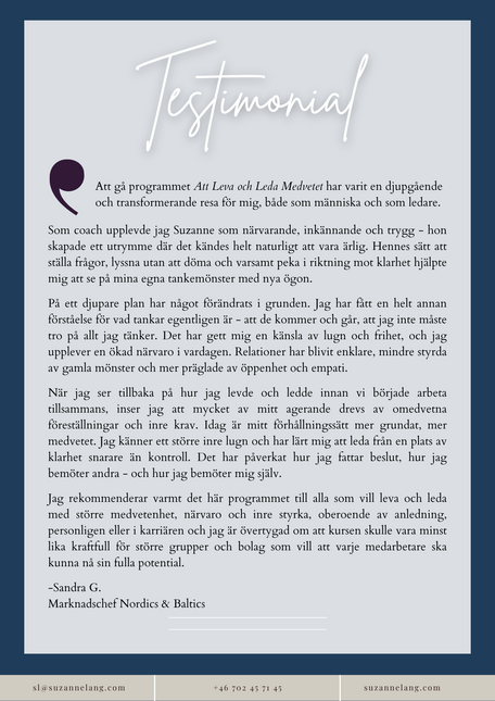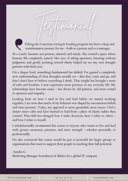This program opens up a choice: to continue operating on autopilot - or to begin leading and living with greater clarity and presence. It is a different kind of program. Not about becoming a better leader, but about being able to carry whatever the future may bring with less inner pressure and more available capacity
